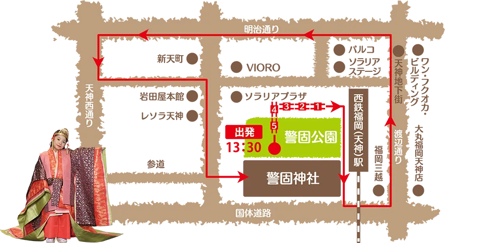 平安衣装等をまとった総勢500人が天神を華やかに練り歩きます。